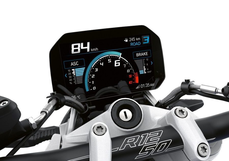 Como antes, la R 1250 R está equipada con una pantalla TFT a color con navegación de flecha integrada y una amplia conectividad. La excelente legibilidad, la clara navegación por los menús y un concepto operativo altamente integrado la colocan en la cima del mundo de las motocicletas de producción. El piloto puede elegir entre visualizaciones de pantalla personalizadas para varios propósitos. Esto también incluye la pantalla Core «Sport», que proporciona información en tiempo real sobre el ángulo de inclinación actual y máximo, así como las intervenciones de control, como ABS Pro o DTC.
