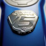 -Tanque de combustible con apoyos para las rodillas, así como un elaborado acabado en color Azul Lupino metalizado con efecto humo y línea doble en el tanque.