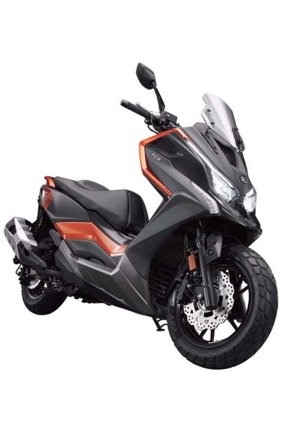El Kymco DT X360 muestra un formato muy moderno y una fulgurante combinación de colores negro, rojo y naranja.