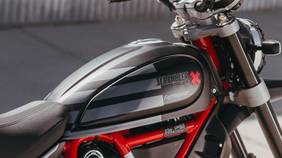 Los colores principales son el negro y el gris, que se combinan en un diseño geométrico en el tanque, en el que se inserta el logotipo de Fasthouse junto al de Ducati Scrambler.