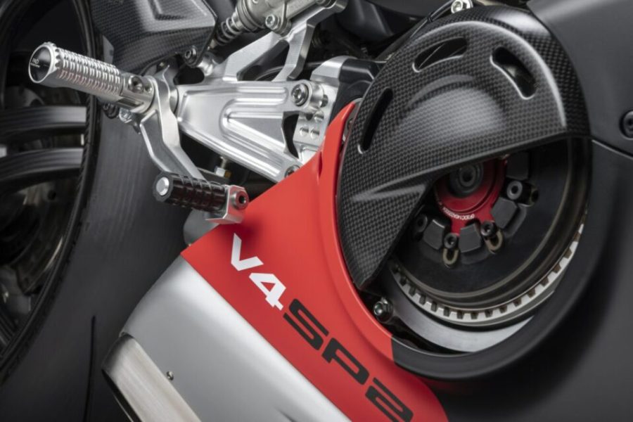 El vínculo con las motos que compiten en el Campeonato del Mundo de Superbikes (WSBK) es aún más evidente en la versión “SP2” de la Panigale V4. A la caja de cambios de la Panigale V4 2022 se le añade una transmisión final con cadena 520 y embrague en seco STM-EVO SBK. Este embrague garantiza una función anti-rebote más efectiva en uso extremo. Además de una mayor fluidez en todas las fases de «corte de aceleración» comparado con el embrague en baño de aceite de la Panigale V4 S.