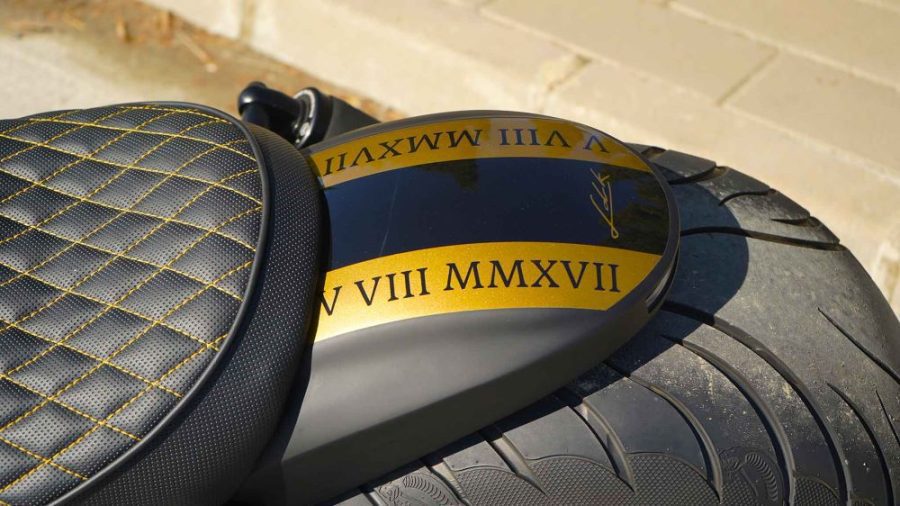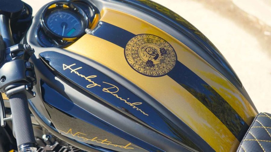 Las líneas doradas, fechas con números romanos y un escudo central debajo del cuentakilómetros, sobresalen en la ornamentación de la Harley.