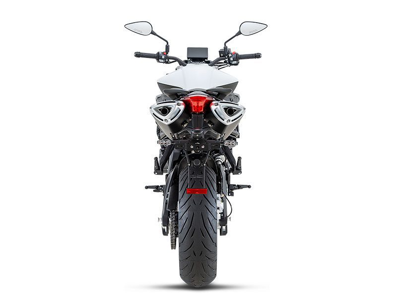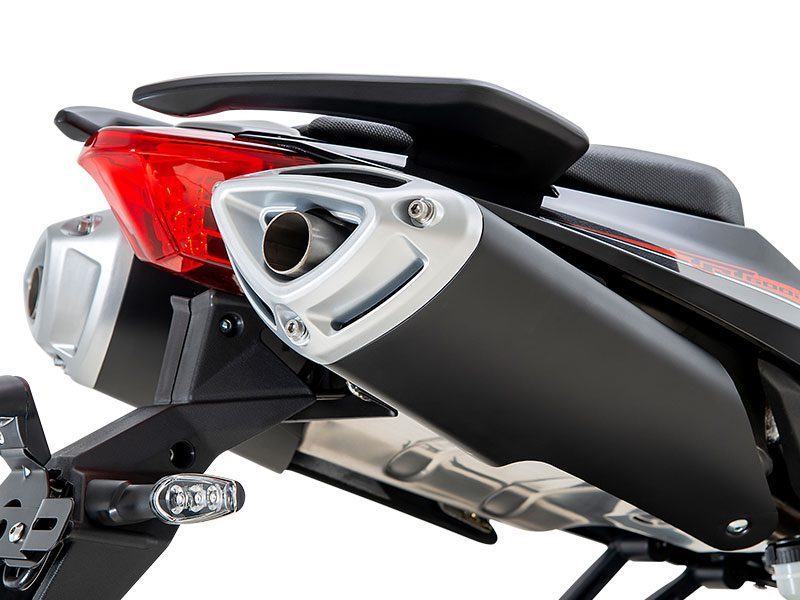 La Naked Deportiva tiene una sección trasera renovada y ostenta dos robustos escapes dobles debajo del asiento. Cuenta con doble disco flotante delantero de 320 mm y trasero de 260 mm. Ambos con ABS.
