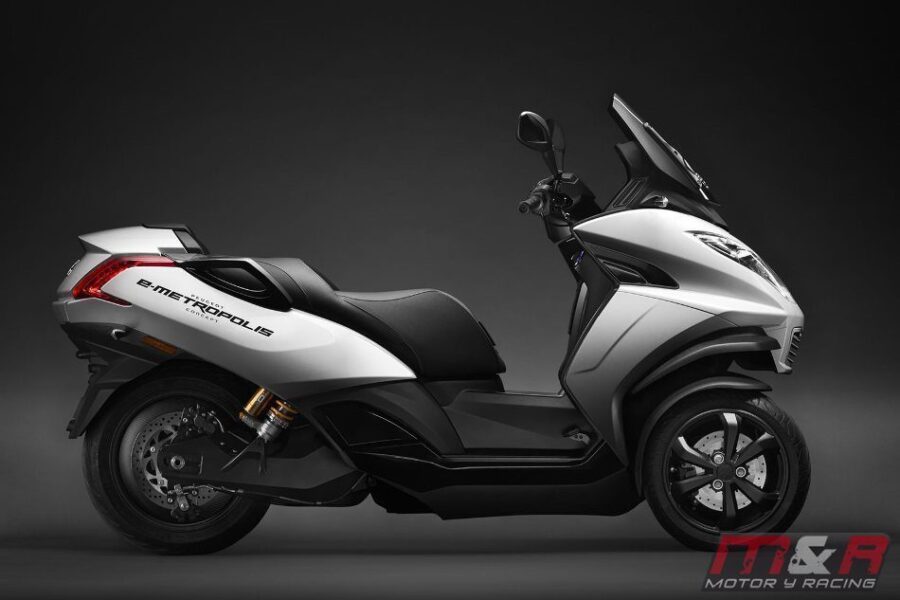 El E-Metropolis que se fabrica en Mandeure cuenta con todos los componentes del clásico Metropolis (arranque sin llave, encendido automático y freno de estacionamiento electrónico) y equipa un motor eléctrico montado sobre el chasis que entrega 36 kW de potencia máxima a la rueda trasera. Su velocidad de punta es de 135 km/h, con una autonomía de 200 kilómetros.