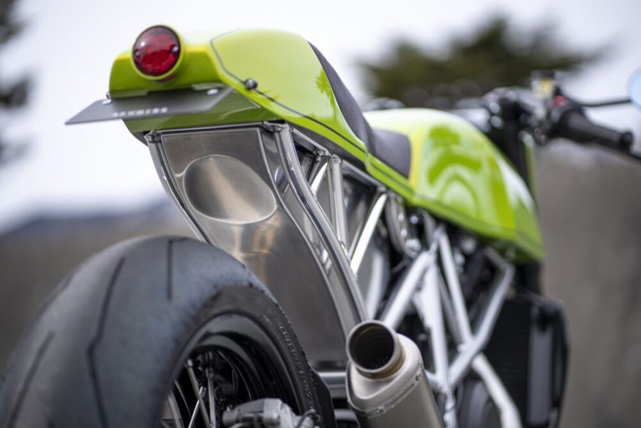 Meticulosamente (como se lo puede ver trabajar en su canal de Youtube), Shiro Nakajima retiró todos los plásticos para reemplazarlos por aluminio. Debajo del enrejado de acero artesanal, a lo Ducati ochentosa, queda al descubierto una mecánica impoluta y, sobre todo, la gran toma de aire frontal. Otra lámina de aluminio torneada aguanta la cola, que remata con una diminuta luz de stop vintage. El faro delantero está enmascarado en metal a tono con la carrocería.