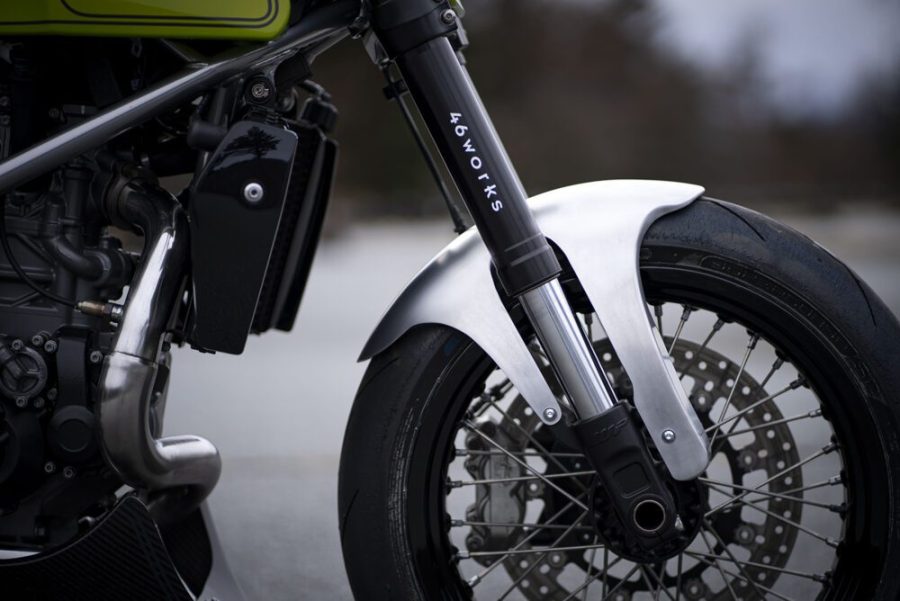 De la moto original el artista mantuvo basculantes, suspensiones y frenos aunque el cambio de carrocería lo llevó a diseñar un subchasis a medida.