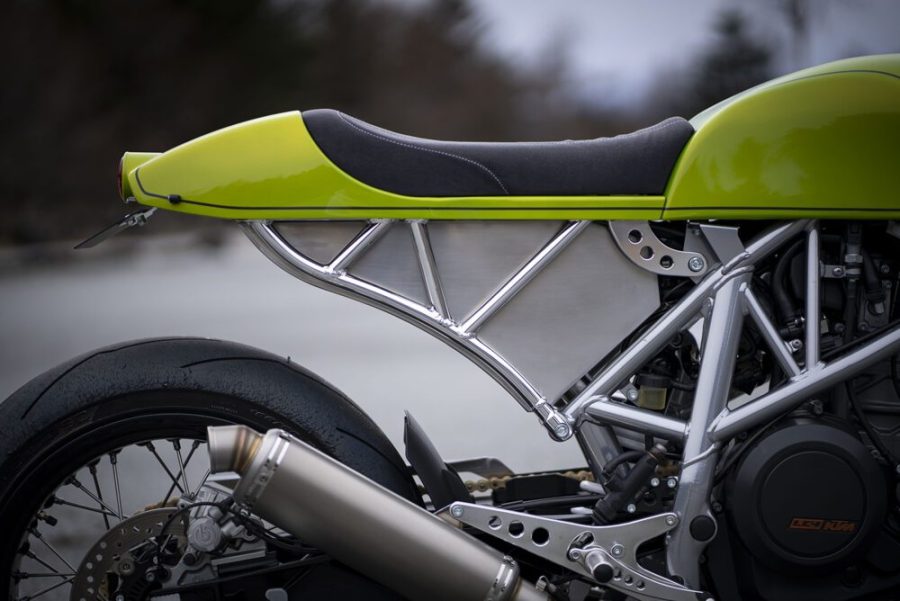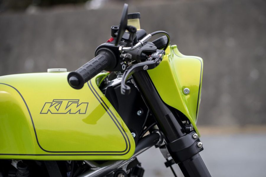 En la Duke reformada, Nakajima logró una postura baja y deportiva porque en su opinión, «cuanto más baja es la moto, más divertida es. Eso se refleja también en el color verde lima fluorescente que echa por tierra de que toda KTM debe ser naranja. Pocos recuerdan ya que alguna vez la factoría austríaca dotaba de esa tonalidad a sus modelos.