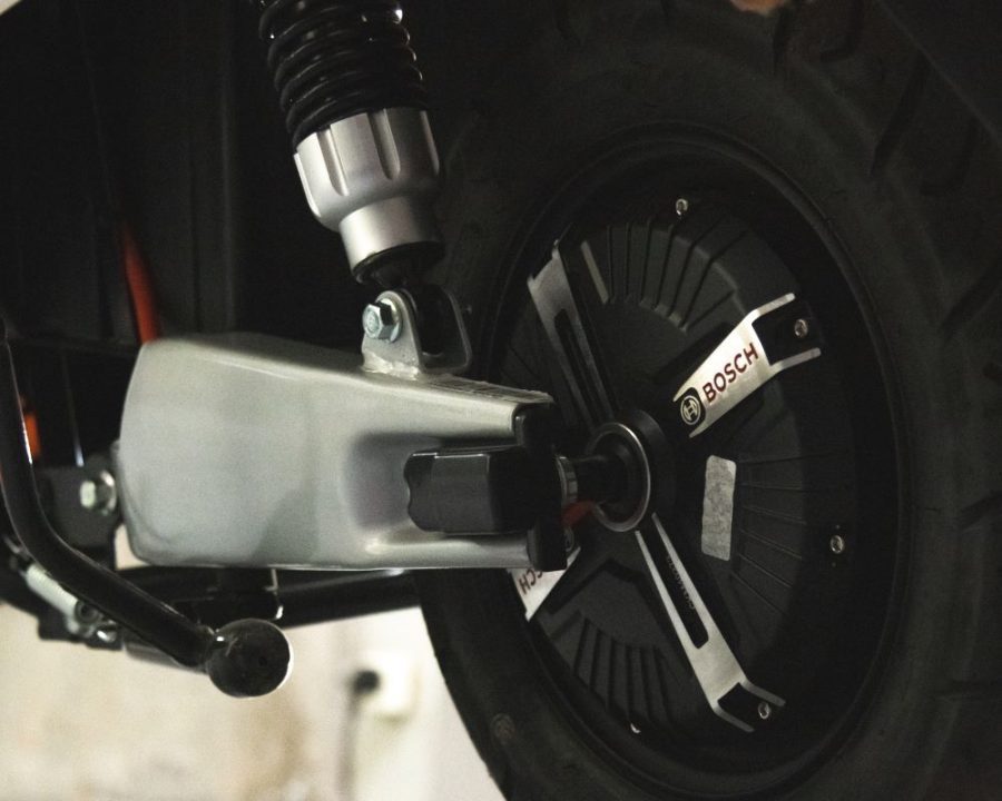 El impulsor eléctrico, alojado en la rueda trasera, se alimenta de una batería de litio extraíble de 60V- 20Ah, que se carga en una toma domiciliaria entre 6 y 8 horas.