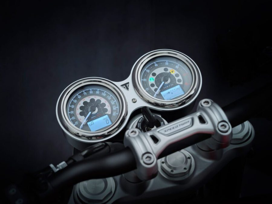 Por último, la Triumph Speed Twin 2021 se distingue por su tanque de 14,5 litros con huecos para las rodillas. Los retrovisores están instalados al final del puño y detenta varias piezas dignas de mencionar. Lo guardabarros en aluminio pulido y el  acabado de los paneles laterales no pasan desapercibidos.  Ahora, los soportes del faro tienen nueva terminación anodizada, como el basculante. La tapa del tanque es del tipo Monza.