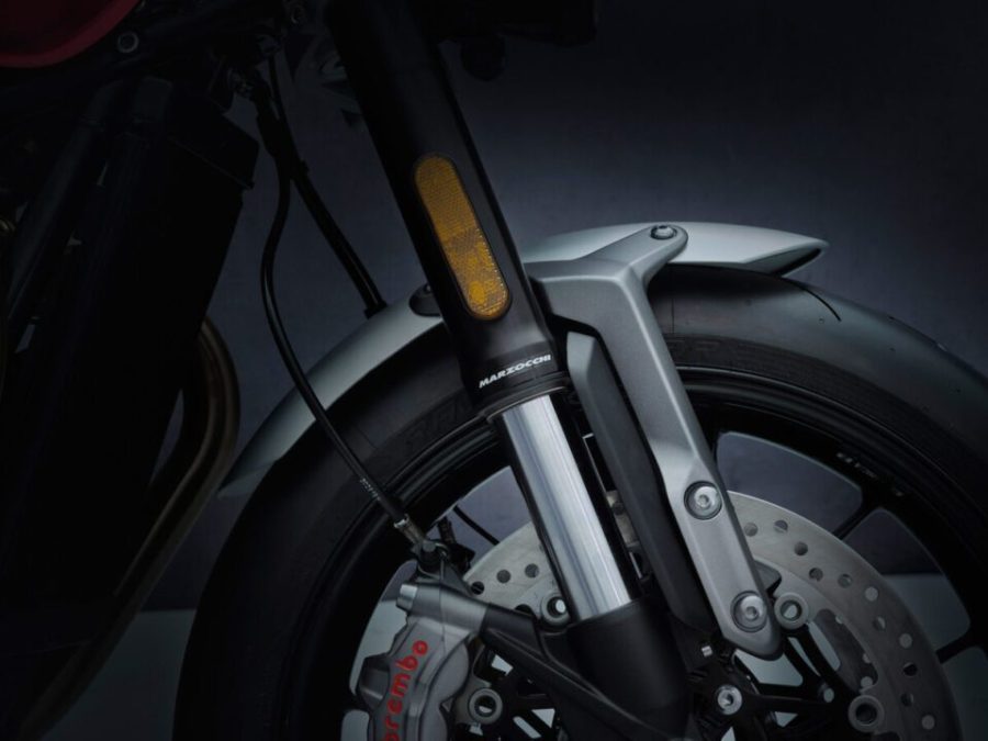 Otra novedad está en los frenos, con las indiscutidas pinzas Brembo M50 monobloque de 4 pistones y anclaje radial. Calza discos de 320 mm de la misma marca. En el eje trasero cuenta con una pinza Nissin de 2 pistones con un disco de 220 mm.