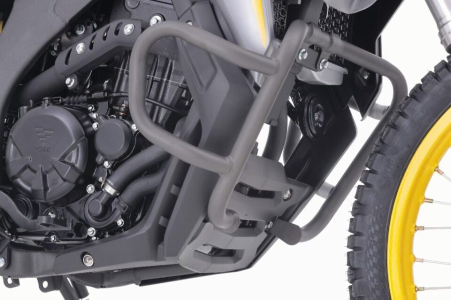 En cuanto a suspensiones, la VOGE 300 Rally recurre a una horquilla invertida y monoamortiguador trasero, ambos regulables. Claro está que esta VOGE incorpora los elementos de protección típicos, desde el chapón para el cárter hasta las defensas laterales. La parrilla trasera sirve también de asideras para un eventual pasajero y está preparada para anclar un top case y maletas.